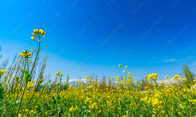 Mustard field with Beautiful snow covered mountains landscape Kashmir state, India .