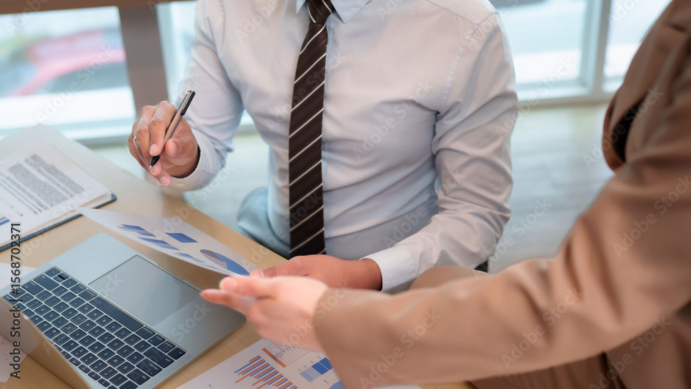 Business professionals adult Asian man woman analyze financial data reports charts graphs laptop office meeting