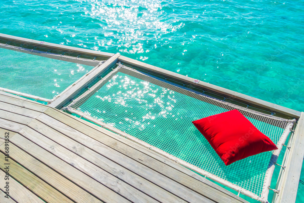 Vacation net seat in tropical Maldives island and beauty of the sea with the coral reefs .