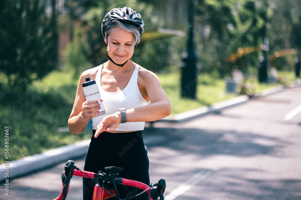 Active senior woman checks smartwatch while hydrating after outdoor cycling on sunny day
