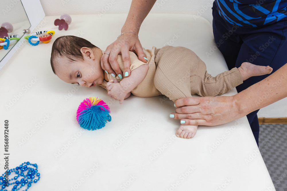 Physical therapist assists child with rollover by correcting leg movement during therapy session. Rollover skill development