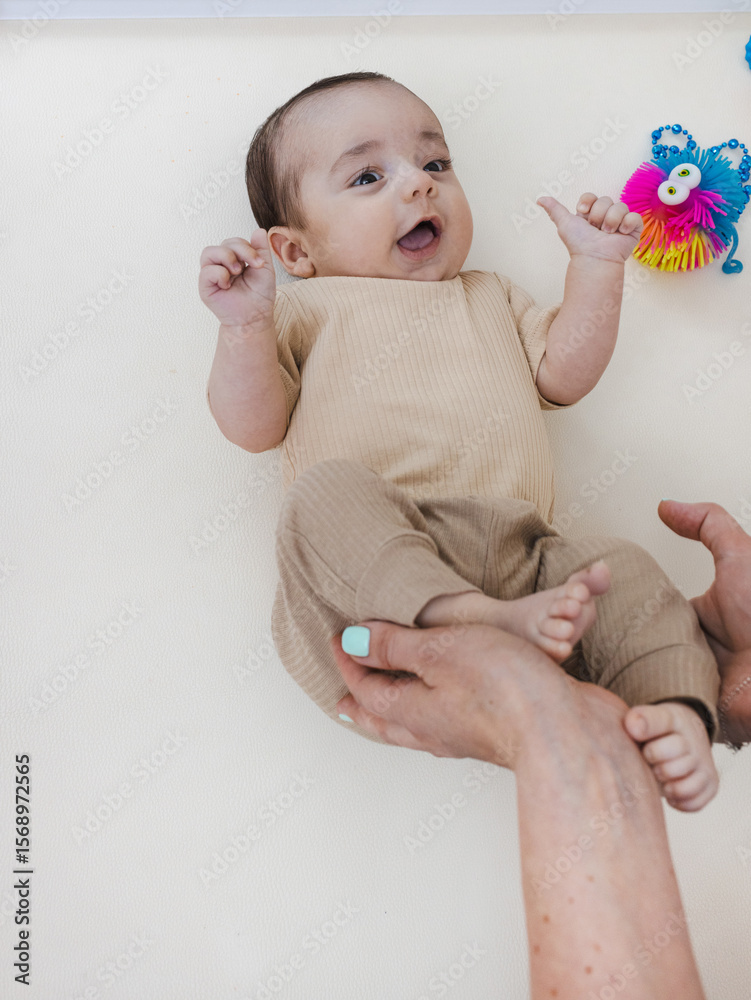 Infant therapy session with visual and motor stimulation using colorful toy during early neurodevelopmental intervention