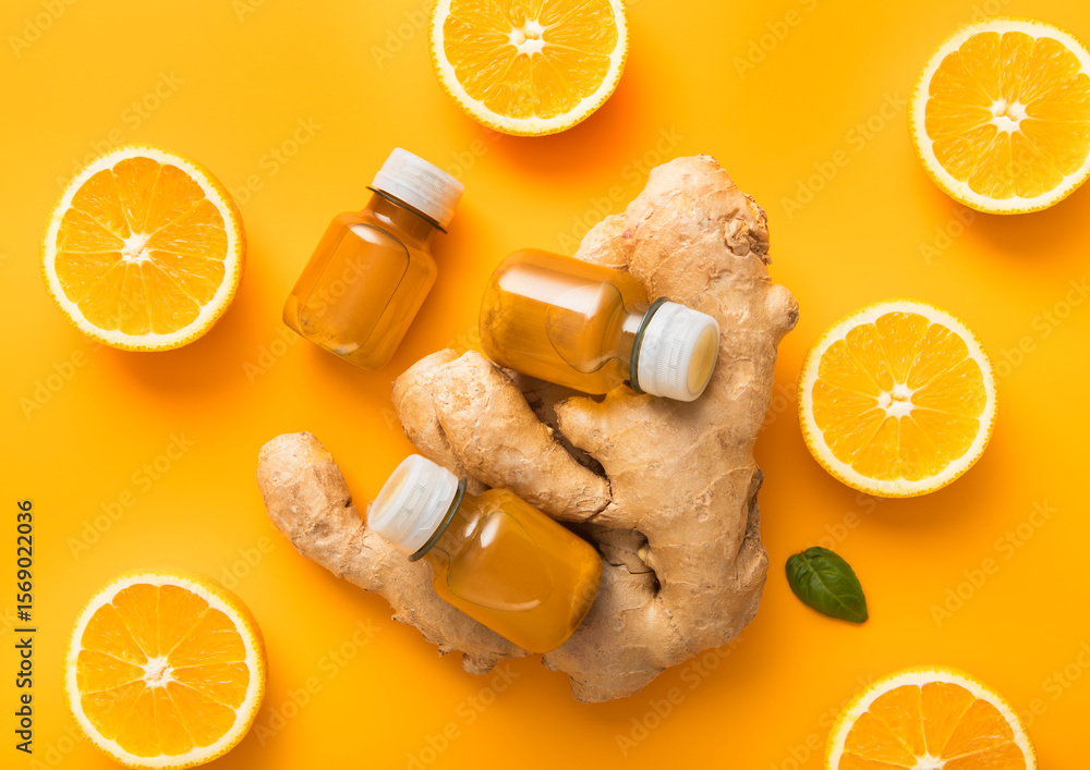 Bottles of turmeric and orange energy immune shot drink with fresh oranges slices on orange background.