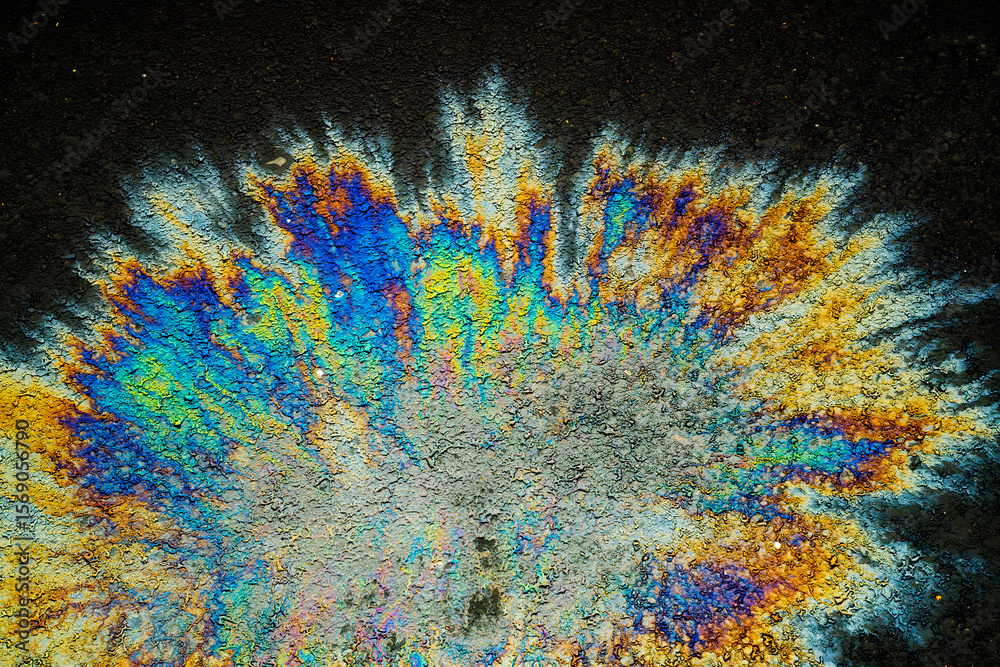 Oil stain on Asphalt road after rain, color Gasoline fuel spots on Asphalt Road