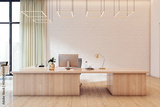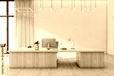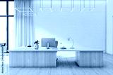 Modern corporate office interior with wooden desk, desktop computer, and stylish lighting in bright waiting area with city view and curtains. 3D Rendering