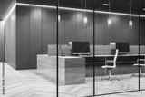 Modern dark grey office interior featuring wooden desks, glass partitions, pendant lamps, and spacious workstation area with no people present. 3D Rendering