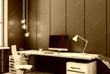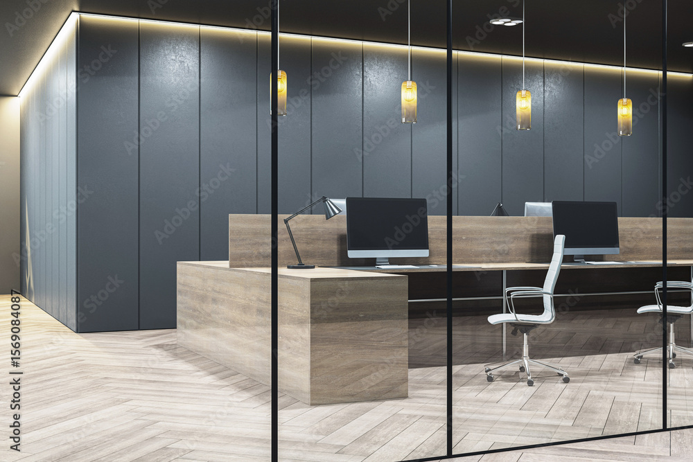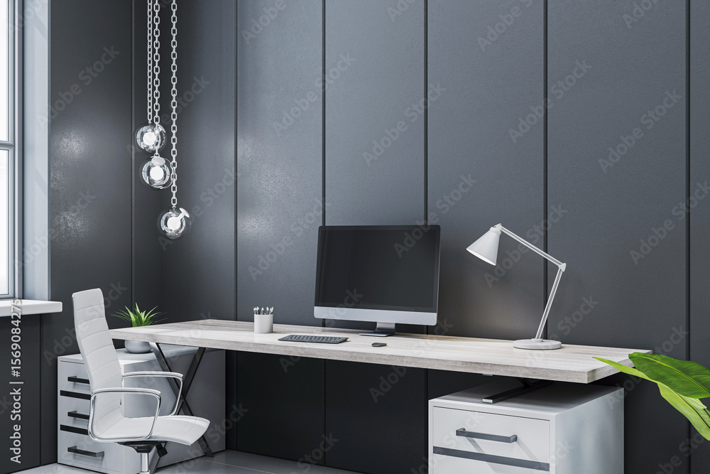 Modern executive office interior with minimalist desk, computer, and white chair in stylish workspace with dark panel walls and elegant lighting. 3D Rendering