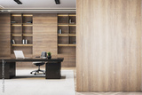 Modern luxury office interior with executive desk, wooden bookshelves and blank wooden wall for logo or poster mockup template background. 3D Rendering