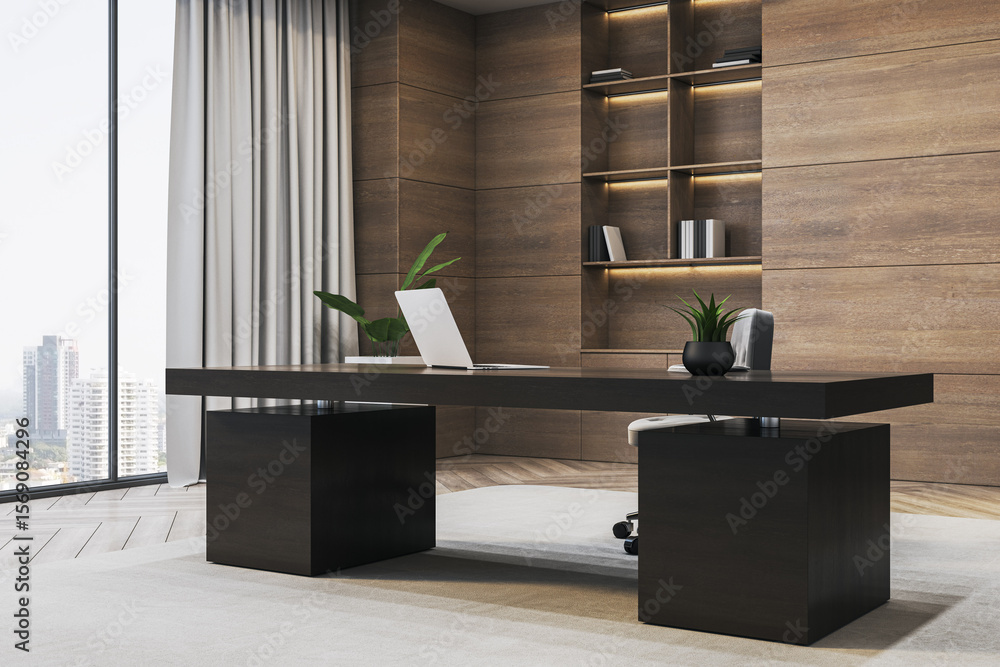 Modern luxury executive office with black desk, wooden walls, built-in bookshelves, city view through window, and stylish minimalist decor.. 3D Rendering