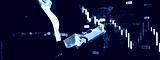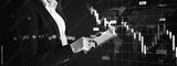 Businesswoman using digital tablet analyzing global stock market crash with red downward candlestick chart on dark background screen display.