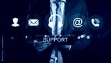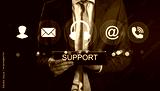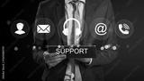Businessman holding digital tablet with virtual icons representing customer support communication services in a professional setting.