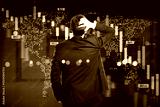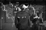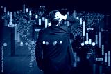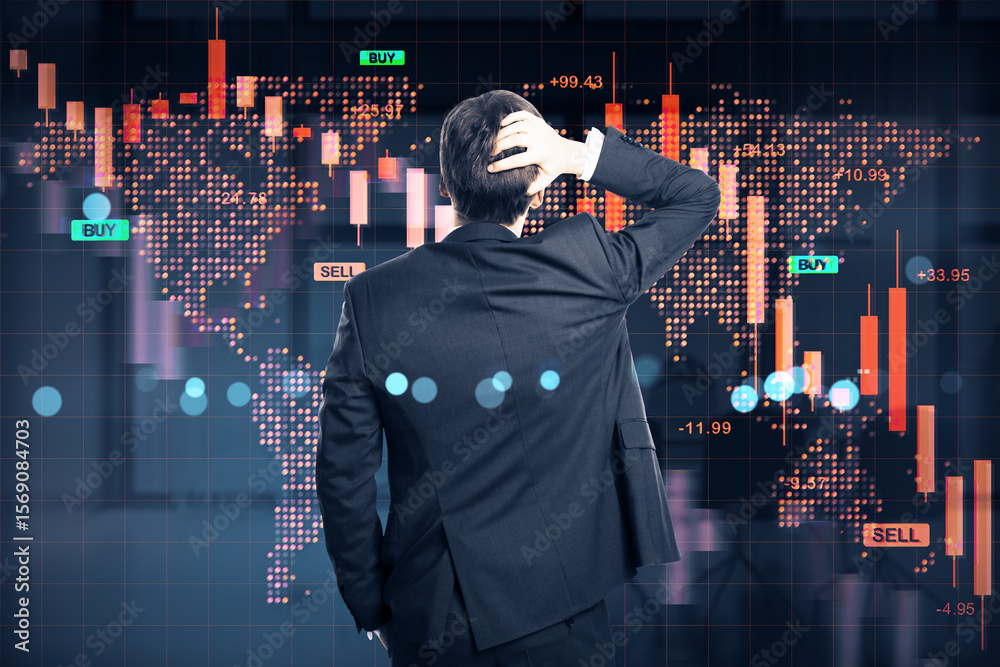 Businessman looking at falling stock market chart representing global financial crisis on abstract background with red downward trend bars.
