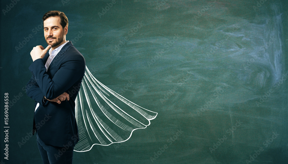 Confident businessperson with superhero cape illustration standing in front of chalkboard wall symbolizing leadership and professional success.