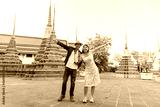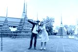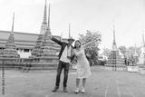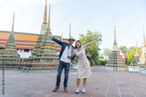 Asian couple tourists visiting Thai temple in Bangkok Thailand on summer holidays