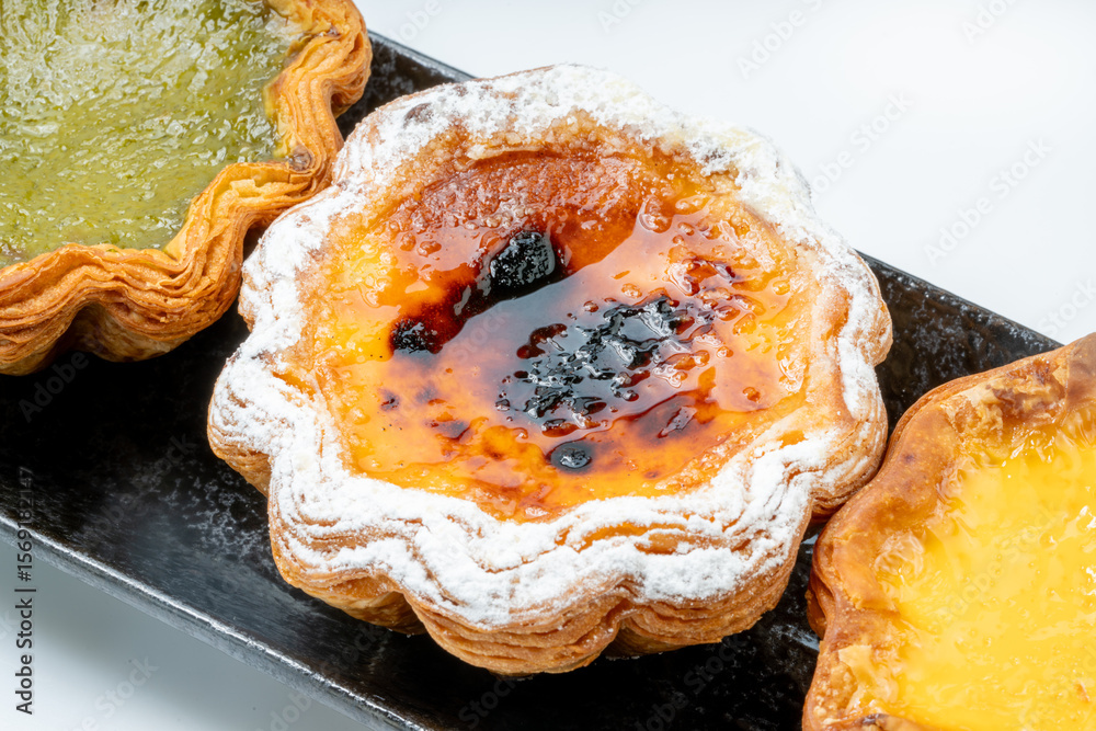 Freshly baked Egg tart in black plate on white background, Egg tart in black plate on white.