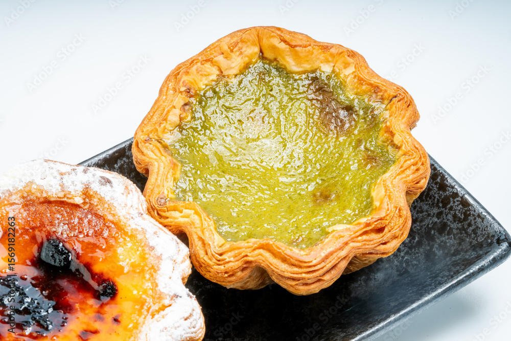 Freshly baked Egg tart in black plate on white background, Egg tart in black plate on white.