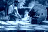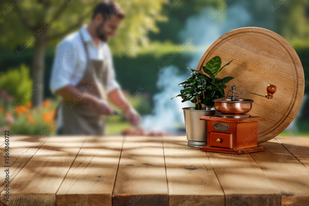 Wooden garden table with a man at barbecue grill and garden in background – outdoor cooking concept with product placement space