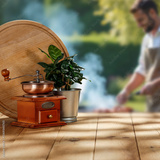Wooden garden table with a man at barbecue grill and garden in background – outdoor cooking concept with product placement space