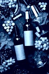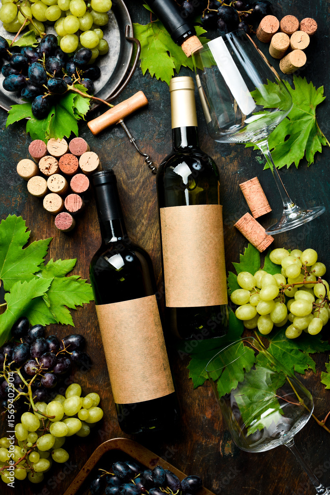 Two bottles of wine on a stone table. Top view. Free space for text.