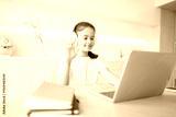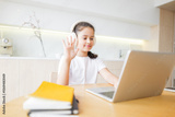 Young girl engaging in online learning with enthusiasm at home during the afternoon, connecting with knowledge through technology