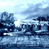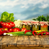Fresh spring, summer and autumn vegetables on a rustic wooden table with blue sky in the background – healthy seasonal food and natural lifestyle concept.