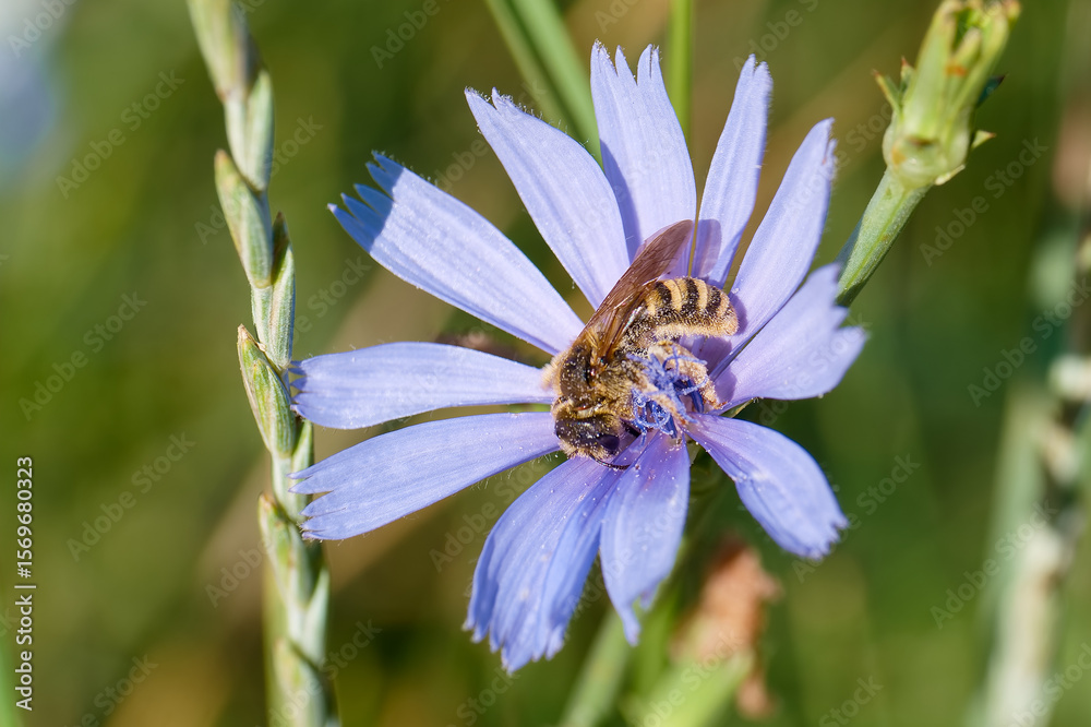 Close up view of a bee collecting pollen from a purple flower on a sunny day in a field