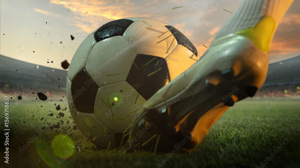 Close-up of a footballer's boot kicking a ball during a 3D-rendered scene on a stadium grass field at sunset. Concept of leadership, decision-making, and vision in captain roles and midfield control