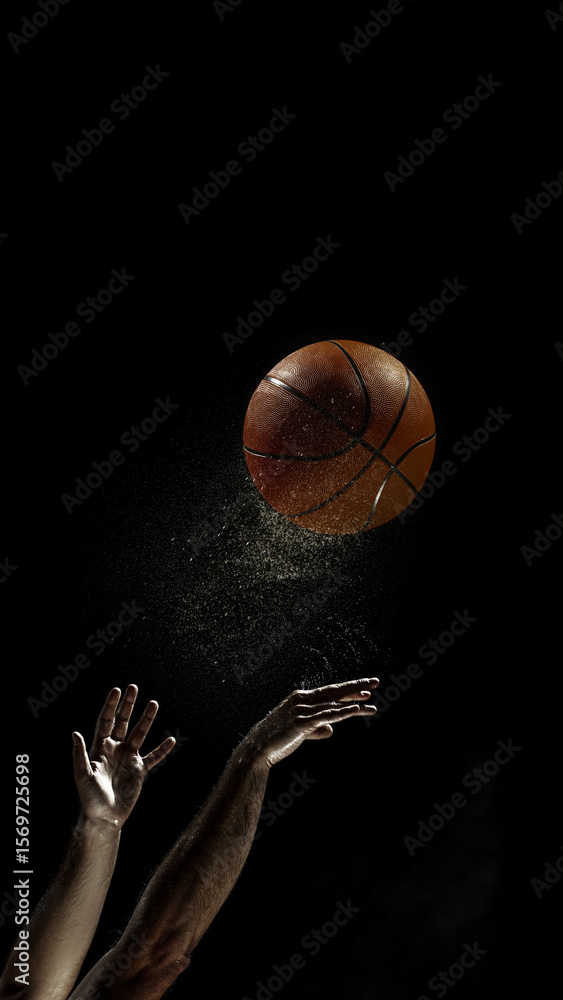 Basketball flies above the court as a player finishes a jump shot, arms fully extended into black sky. Concept of discipline, focus, and consistent self-improvement