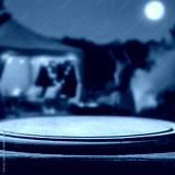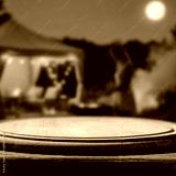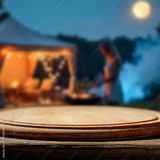 Empty wooden garden table with copy space. Barbecue grill and garden background – outdoor cooking, camping and vacations concept. Warm, social and relaxed atmosphere perfect for summer food campaigns.