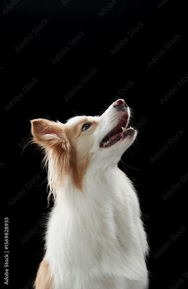 Border collie is seen with its head tilted up as if watching something above. The lighting highlights facial features and ears against the black backdrop.