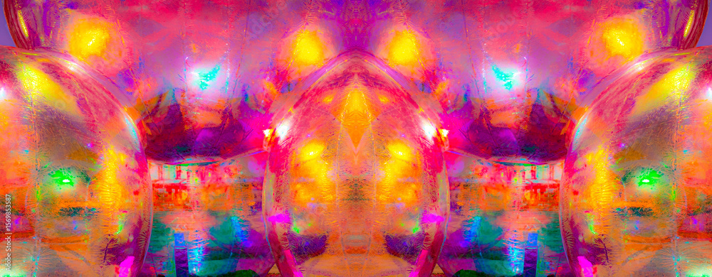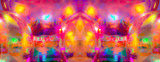 A vibrant, abstract artwork featuring a close-up of a shiny, surface reflecting multicolored light. The dominant hues are red, orange, yellow, and pink, with hints of blue and green.
