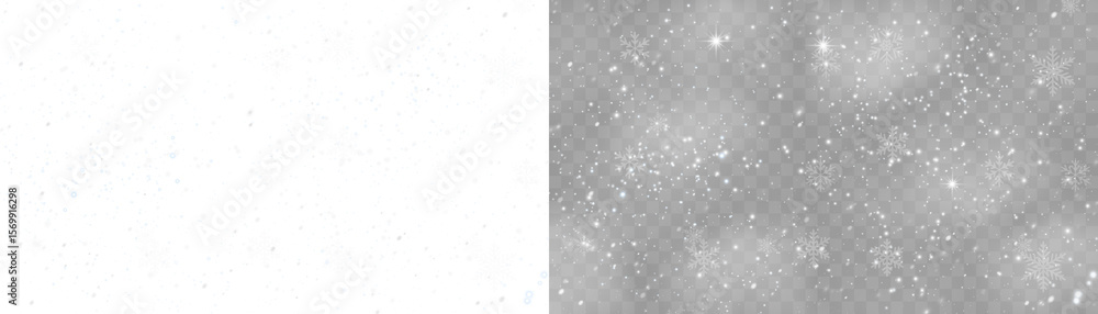 Winter snowfall texture with realistic white snowflakes on transparent background. Use as overlay for New Year cards, holiday posters, or frosty scenes.