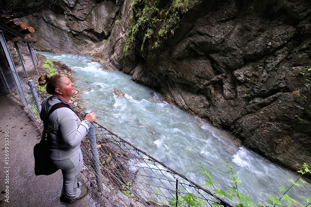Elderly woman hiking in Partnachklamm. Bavarian Alps, Germany.