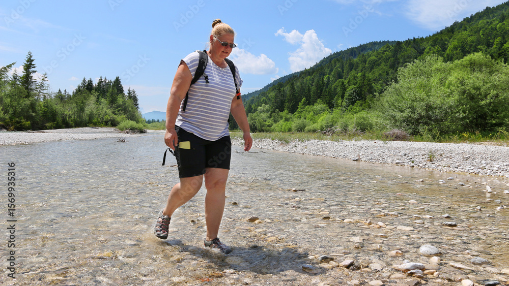 Elderly active Woman wading trough Isar river in Oberes Isartal. Bavaria, Germany