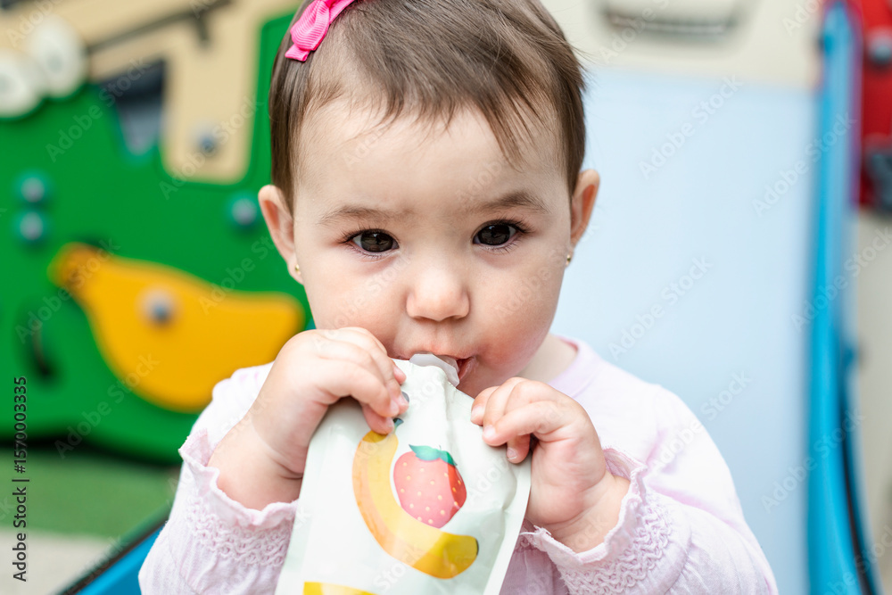 Cute baby girl eating fruit puree from pouch outdoors at play area. Pureed fruit from a squeezable pouch
