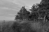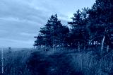 A road in a pine forest at sunset is a beautiful sight to behold.