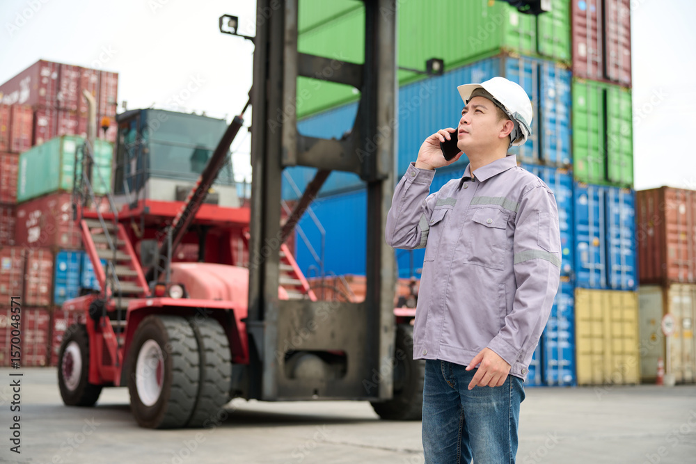 Engineer or worker using smartphone and talking about work in containers warehouse storage