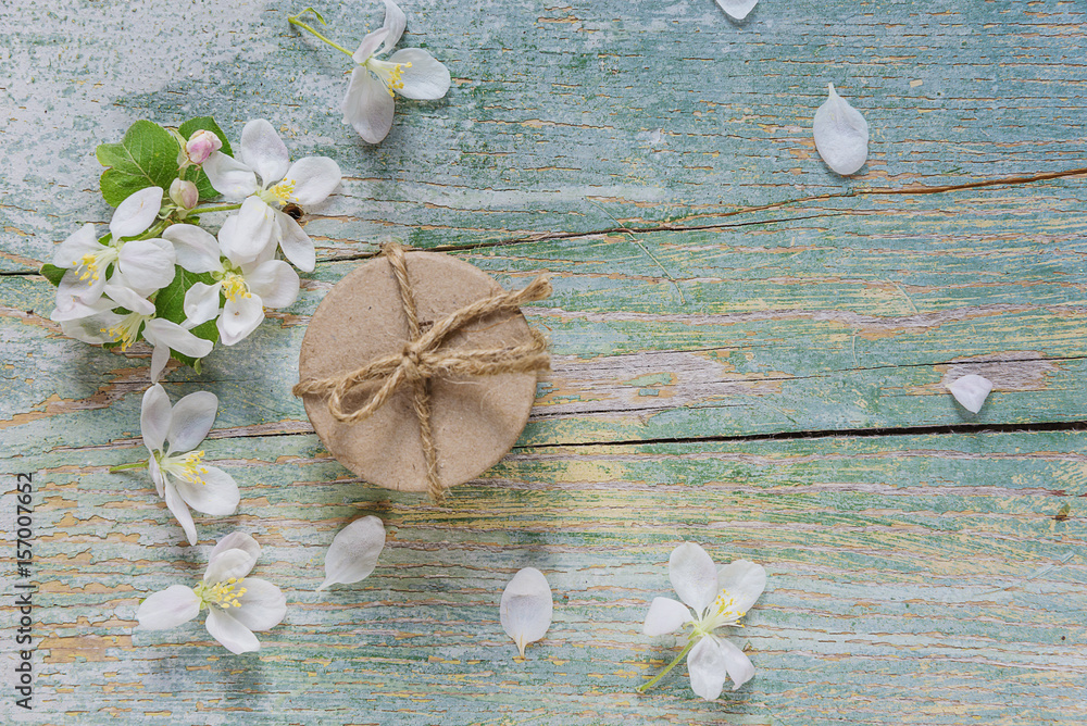 Background from old boards, white flowers and gift box