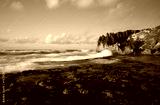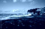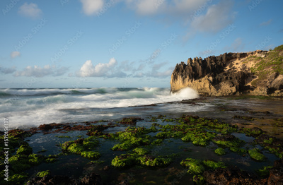 Dramatic coastal landscape in Kauai with bright green sea algea, blue sky, and sharp rocky cliffs