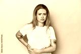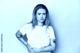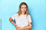 Blonde young woman in white t-shirt on blue background having a liver pain, stomach ache.
