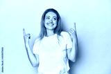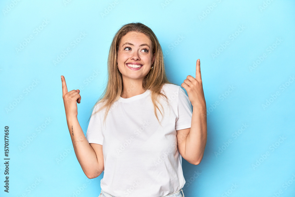 Blonde young woman in white t-shirt on blue background indicates with both fore fingers up showing a blank space.