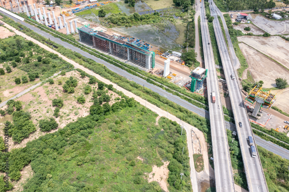 New construction site with crane and mechanical equipments on blue sky background, Infrastructure of high-speed train construction site of Chinese made FuxingHao, base from CR400AF for transportation.