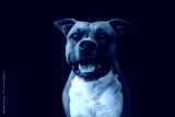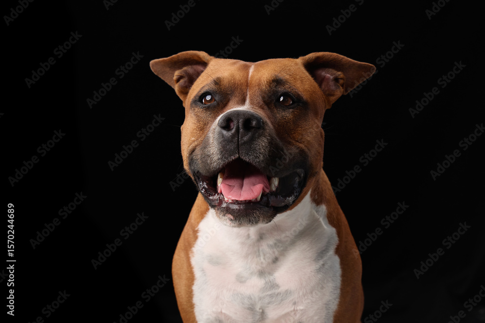 A staffordshire terrier sits still with parted lips and attentive eyes. The strong contrast between dog and black background sharpens the composition.