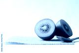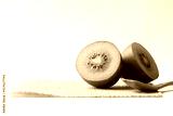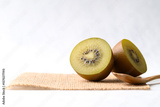 Fresh sungold kiwi fruit on burlap fabric with wooden spoon on white background, Healthy eating
