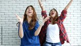 Happy two Asian women holding dollar money throwing falling celebrate happy dance wealth lottery Surprise money raining. Winner Success business woman throw cash Happy money smiling face