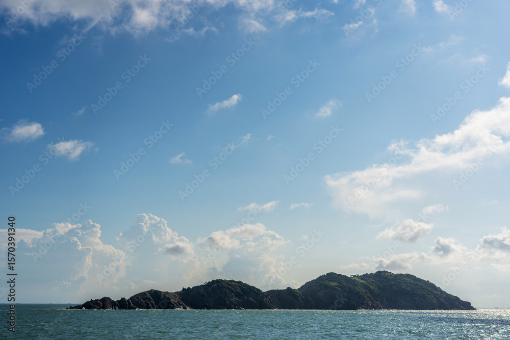Tranquil Coastal Landscape Featuring Distant Island with Lush Greenery