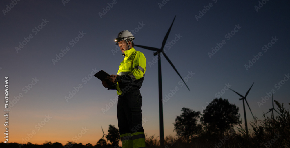 Engineer man working with tablet at windmill farm Generating electricity clean energy. Wind turbine farm generator by alternative green energy.
