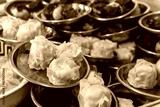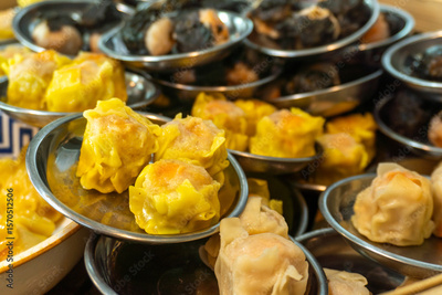 pork shumai, artfully arranged in a small bowl, ready to serve from a traditional bamboo steamer in an authentic Asian kitchen setting