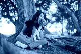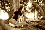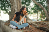 Happy asian woman playing with dog together in public park outdoors, Friendship between human and their pet