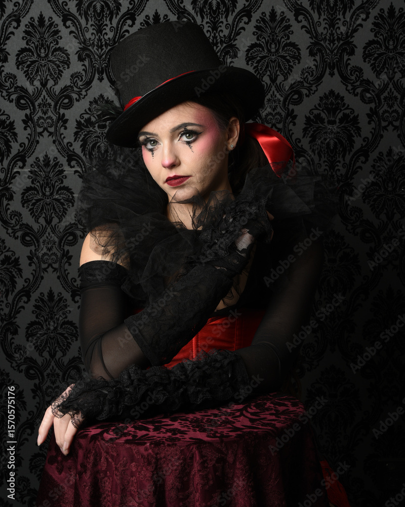 Close-up glamour portrait of circus burlesque model wearing top hat and gothic gloves, theatrical pose. dark fantasy boudoir vintage wallpaper background.